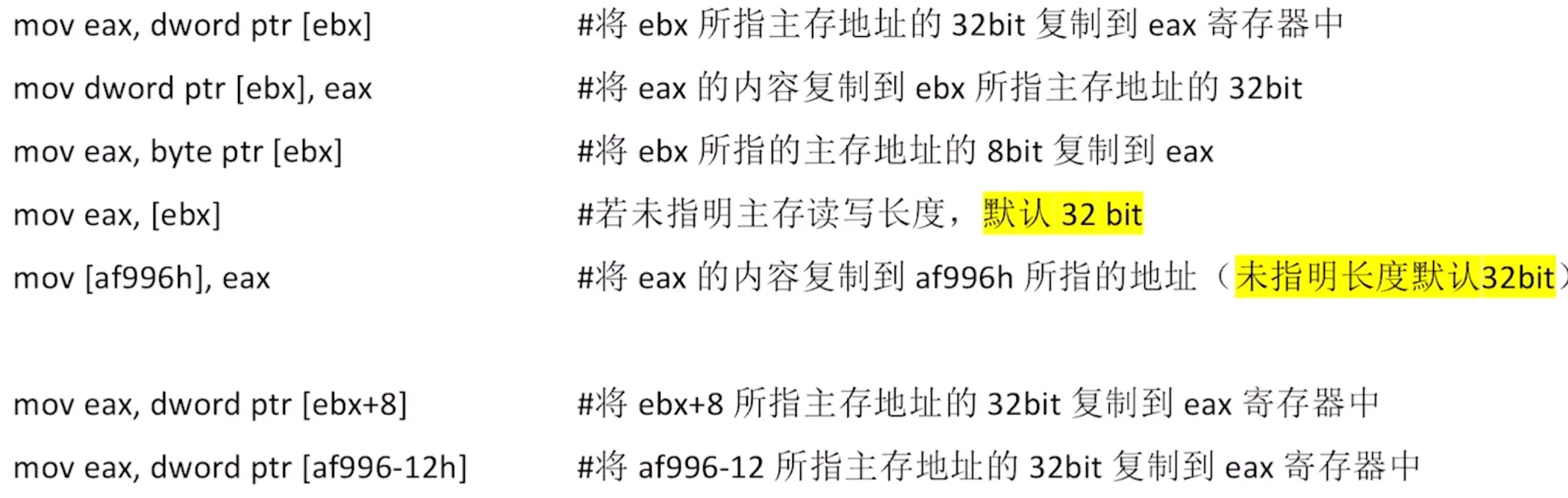 - AX, BX, CX, …: 通用寄存器的 E 去掉的话, 意思是使用该寄存器的低十六位.
