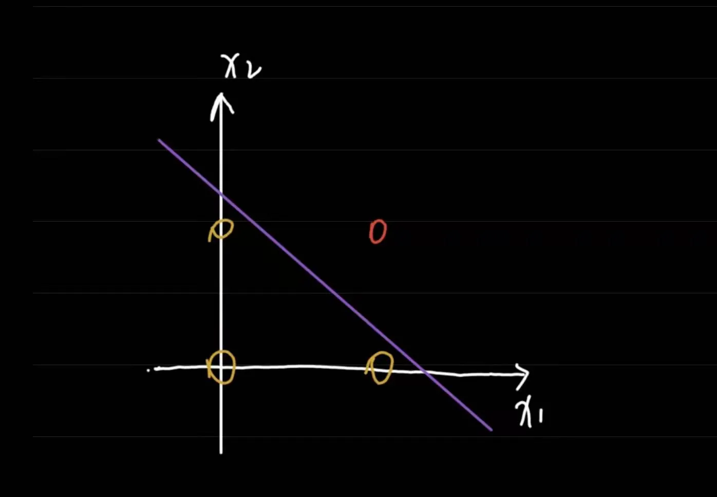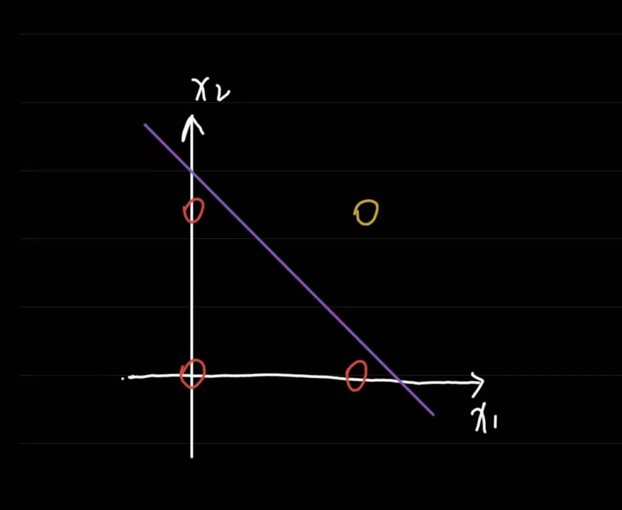 黄色圈圈代表0,红色圈圈代表1,只需要用一条紫色的直线,就可以把0和1区分开来,这就是传说中的线性可分。