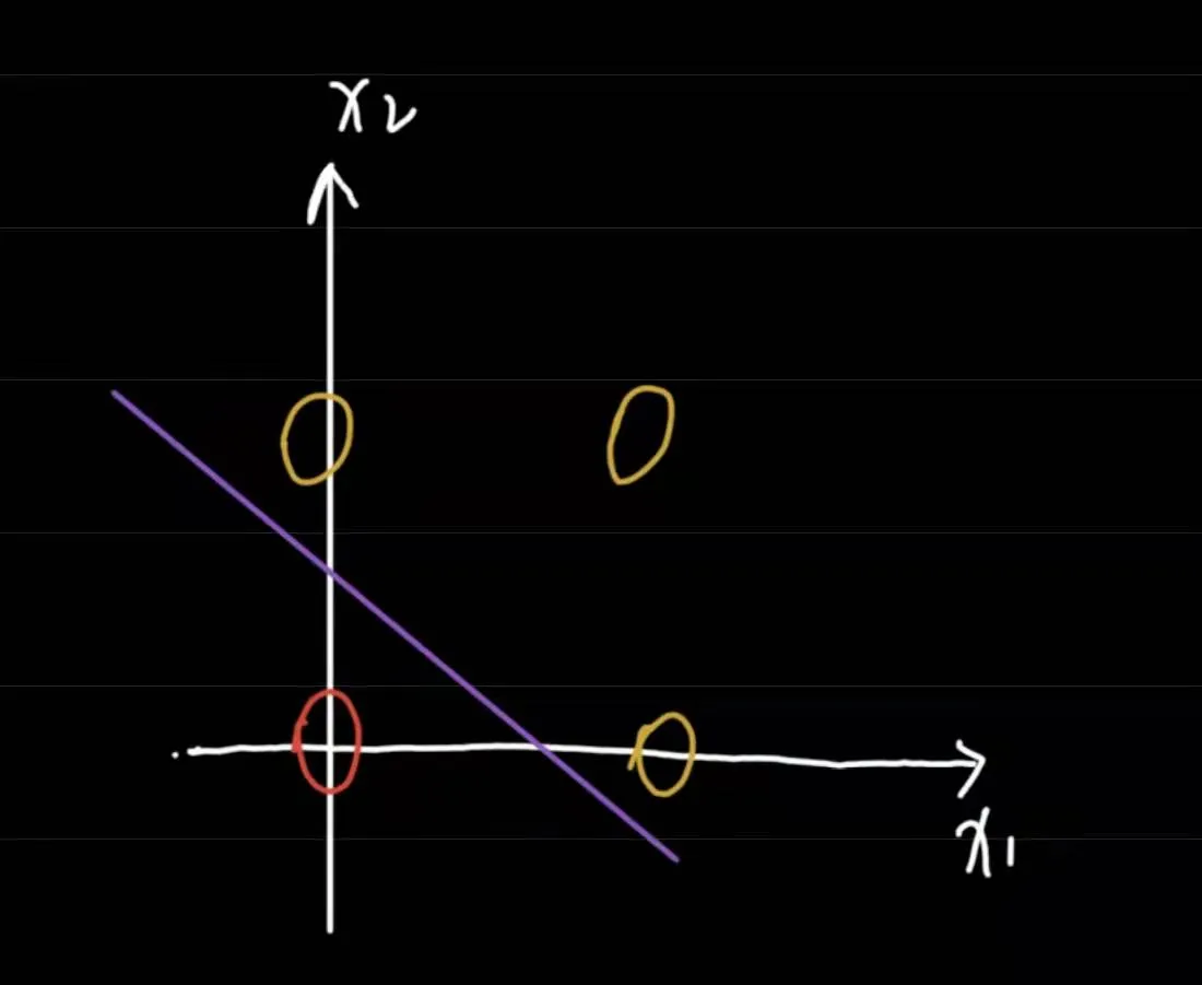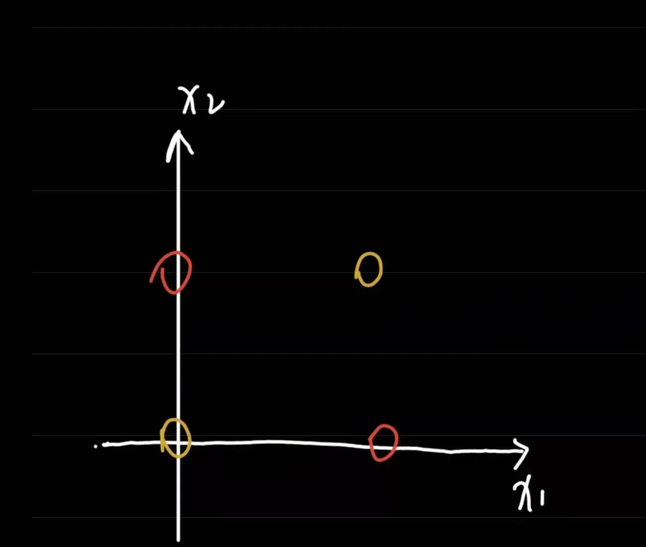 然后我们发现,没有办法划出一条直线,使得红色点与黄色点分布在直线的两边。